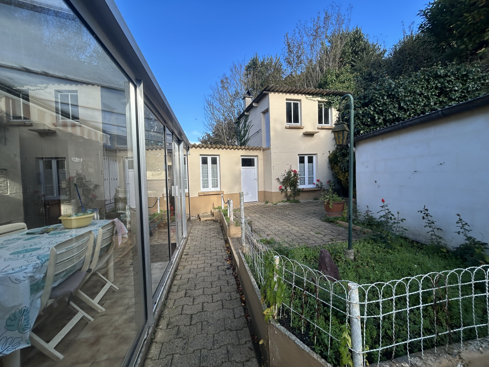 L'intérieur de 110m² est composé d'un coin salon d'environ 30m², une salle d'eau, une cuisine et 4 chambre. A cela s'ajoute une véranda intimiste, au calme. Des fenêtres à double vitrage assurent la tranquillité des occupants. La maison beneficie d'une chaufferie, cave et d'un garage. La maison s'accompagne d'un jardin pour profiter de l'extérieur sur environ 415m², ainsi que d'un second bati a usage de stockage.